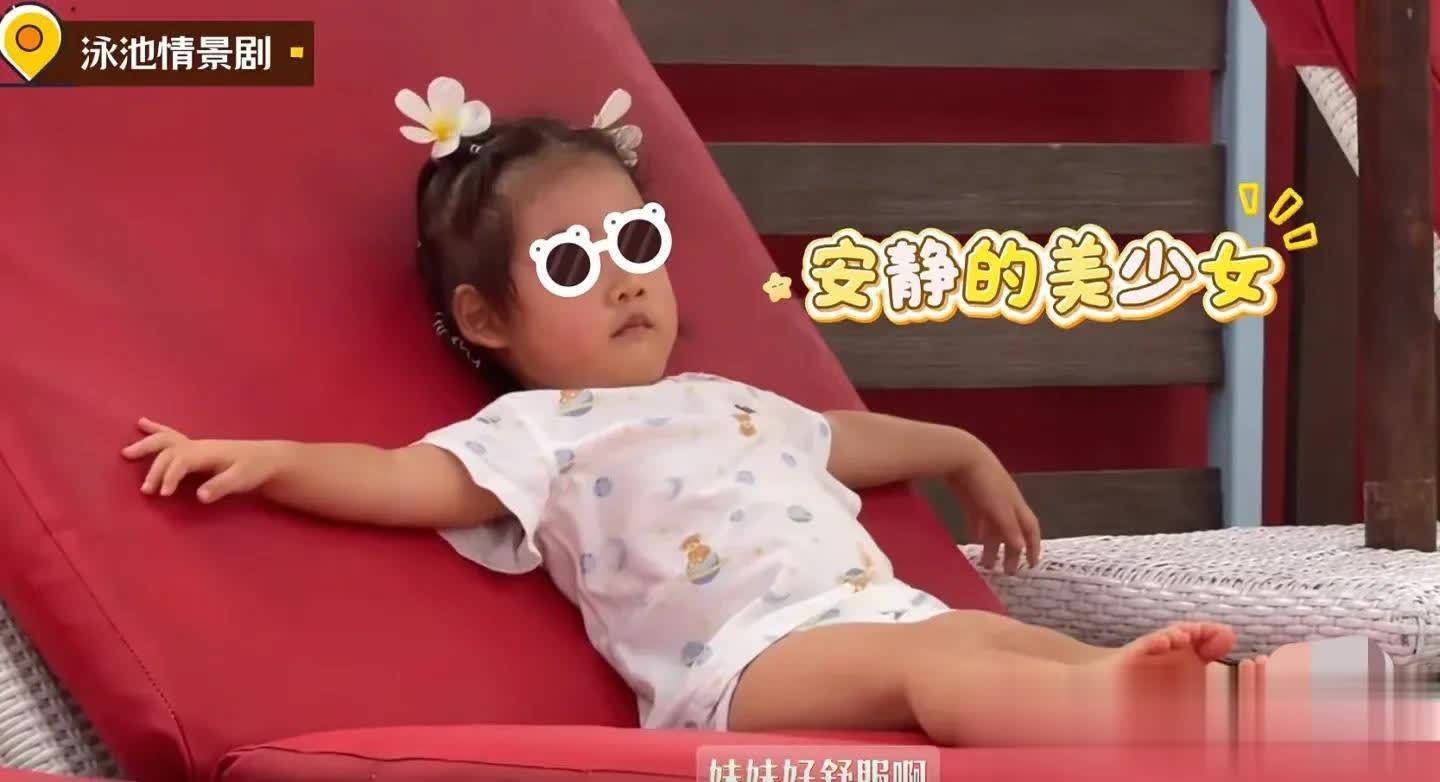 他们在巴厘岛的酒店度假,妹妹没去泳池玩耍,而是躺在沙滩躺椅上晒日光浴。